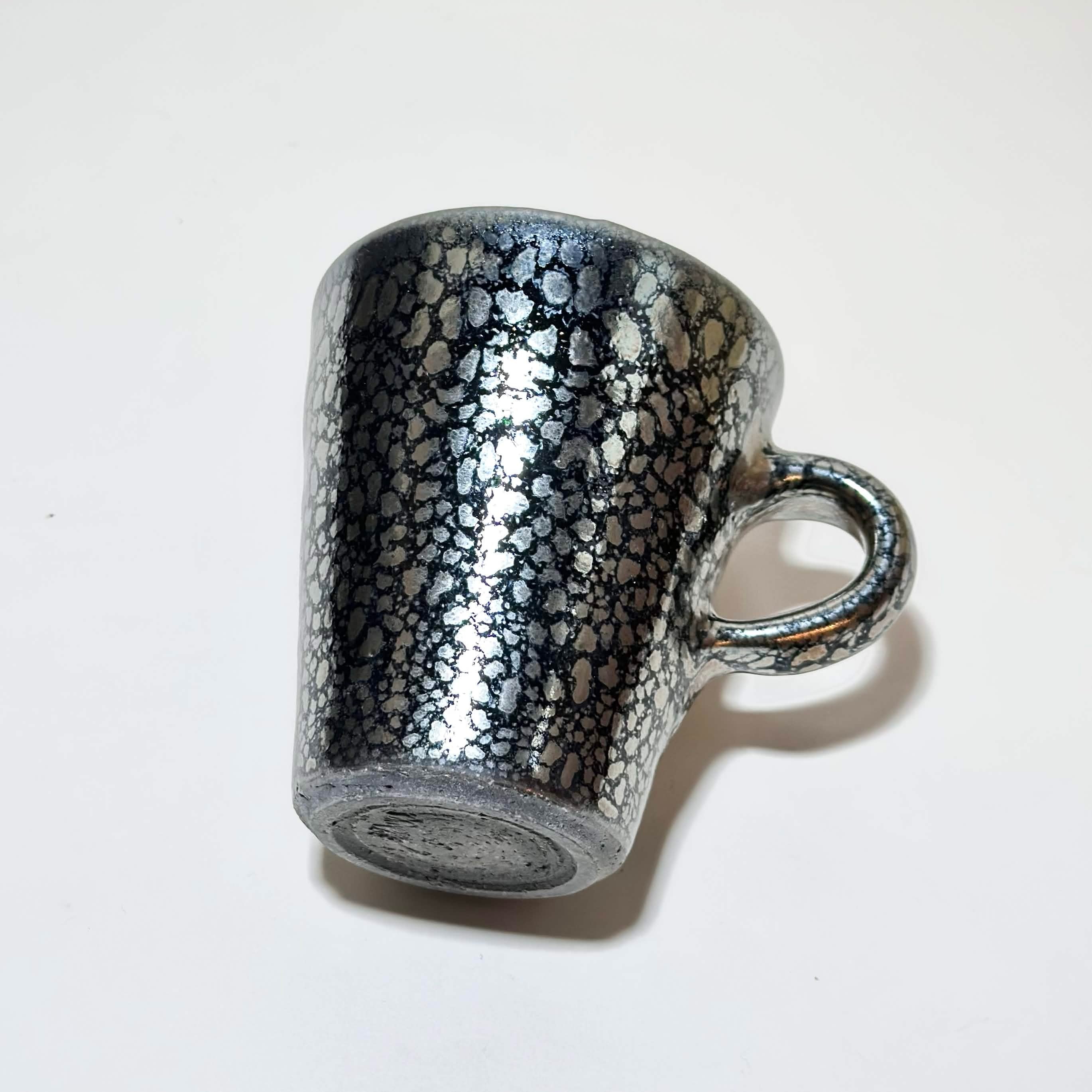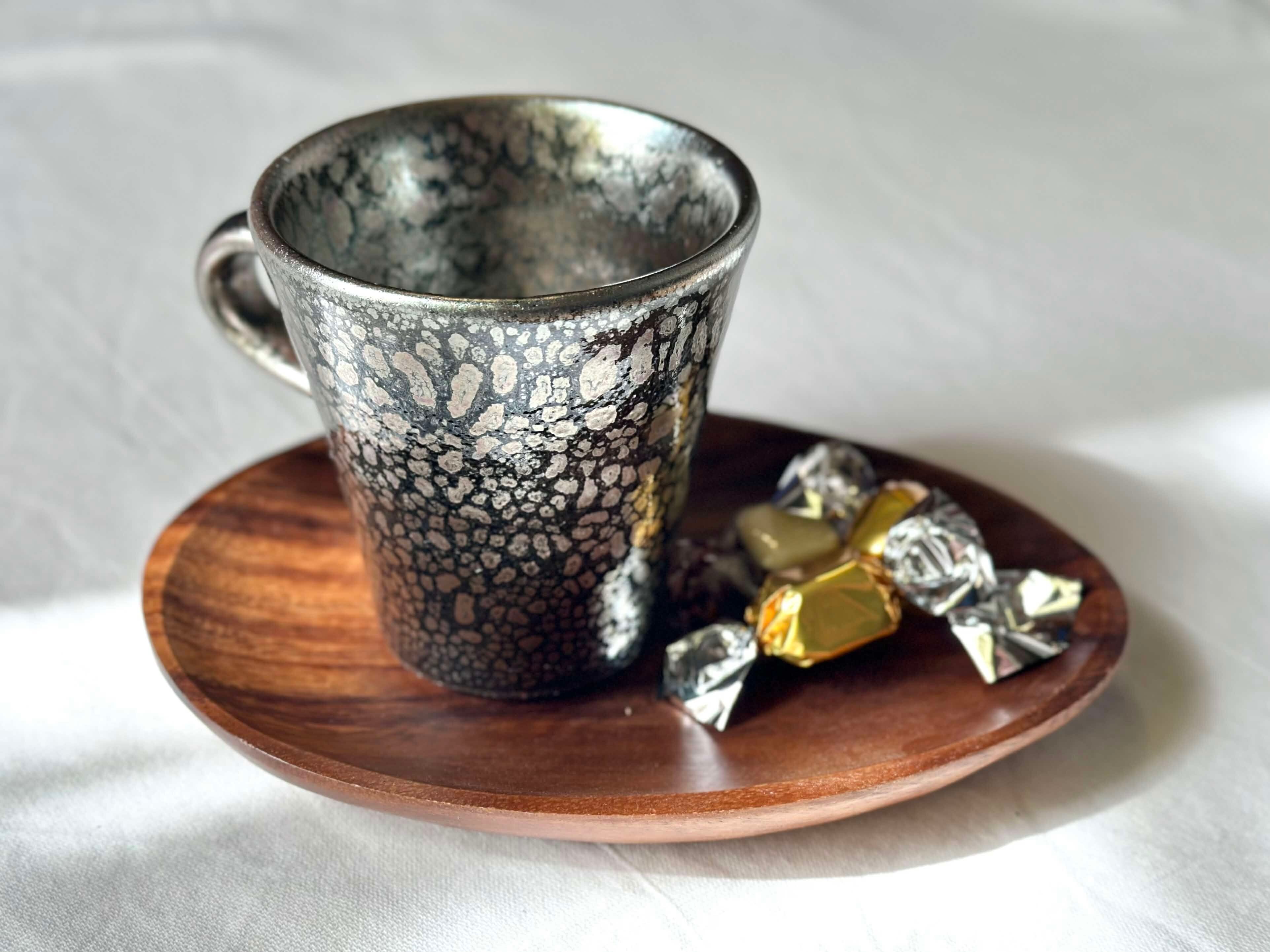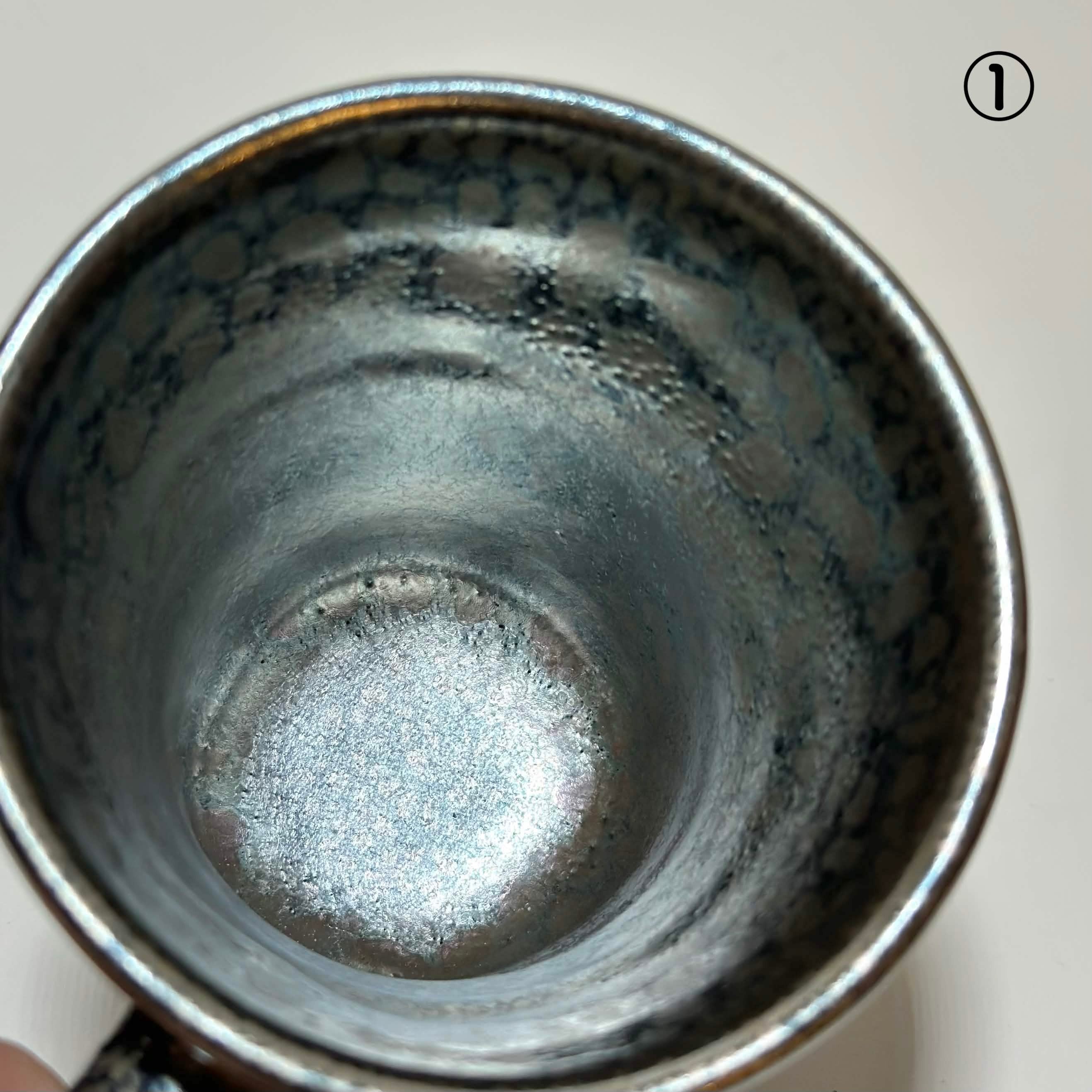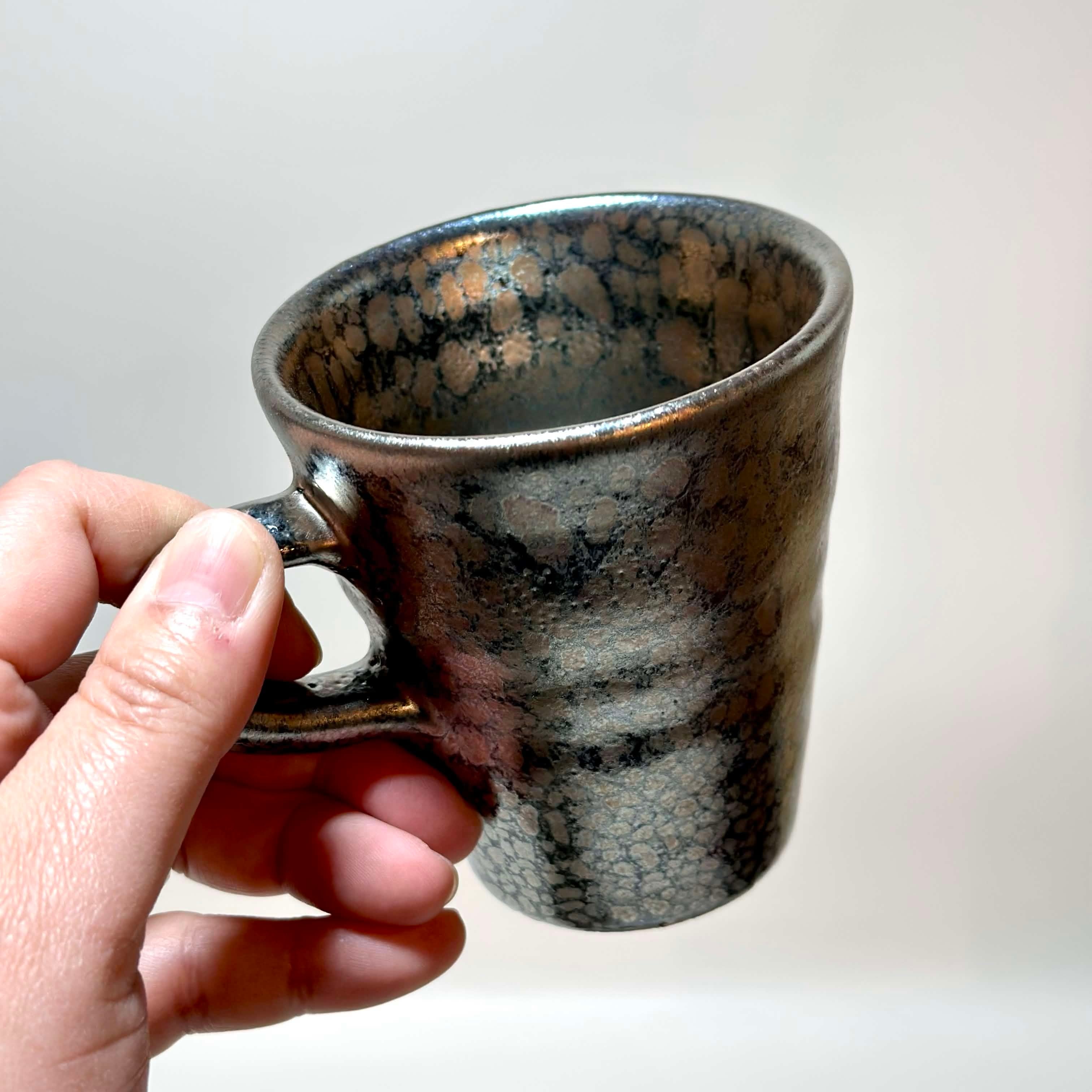 黒の地肌にポツンポツン油が分散してそうな不思議な釉薬です。