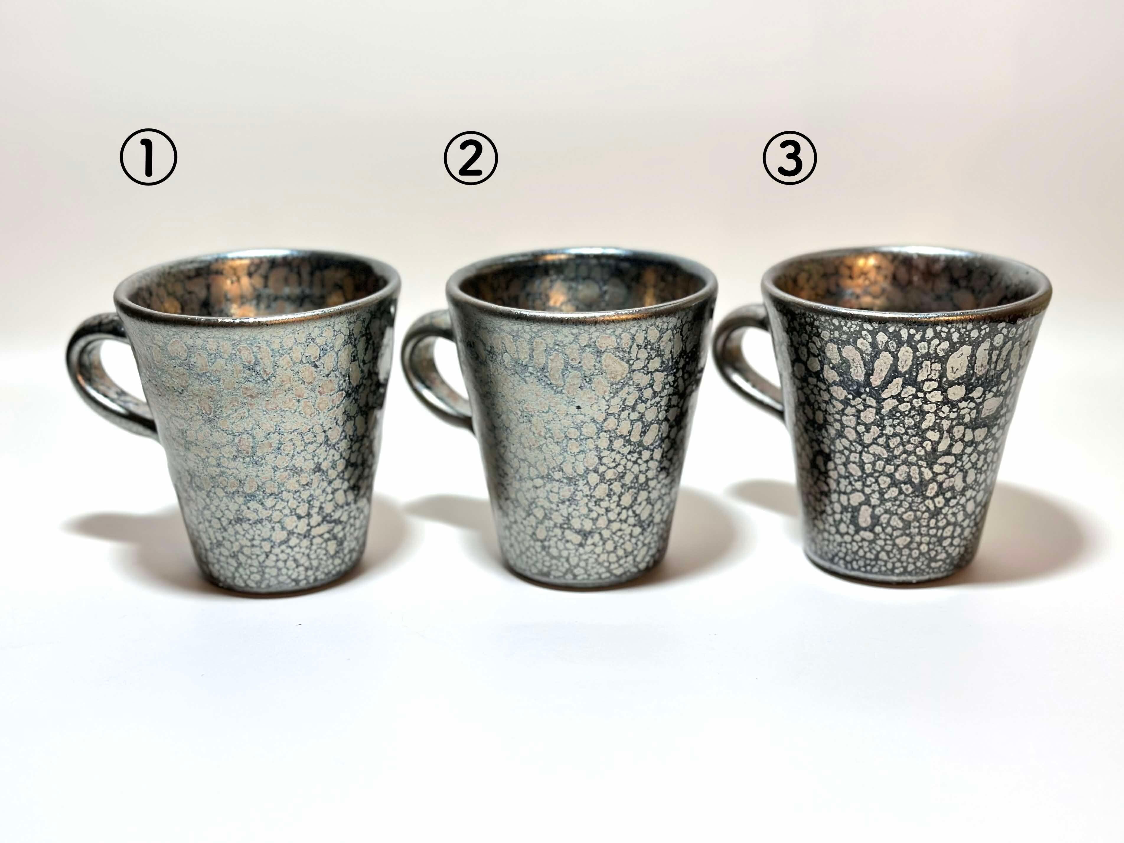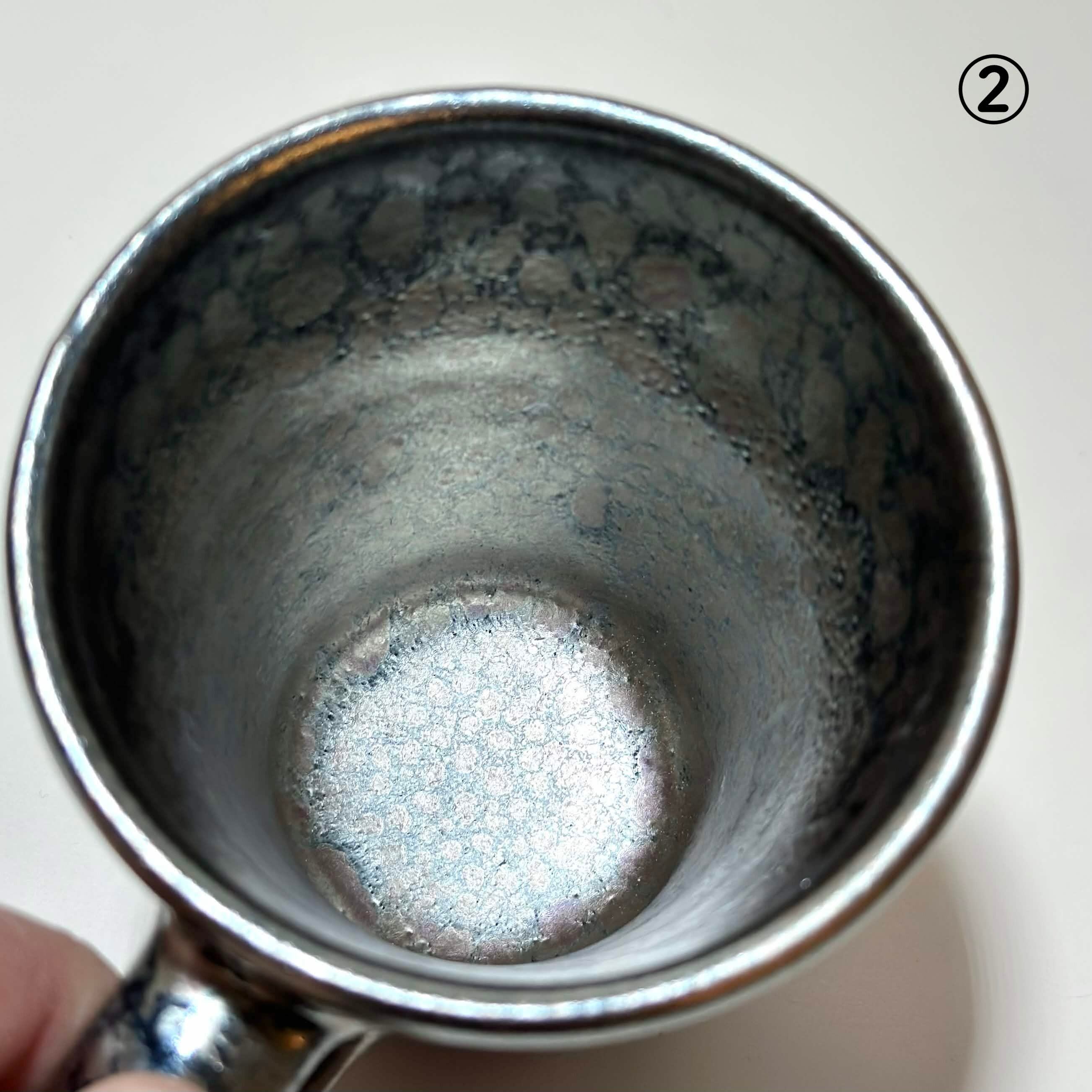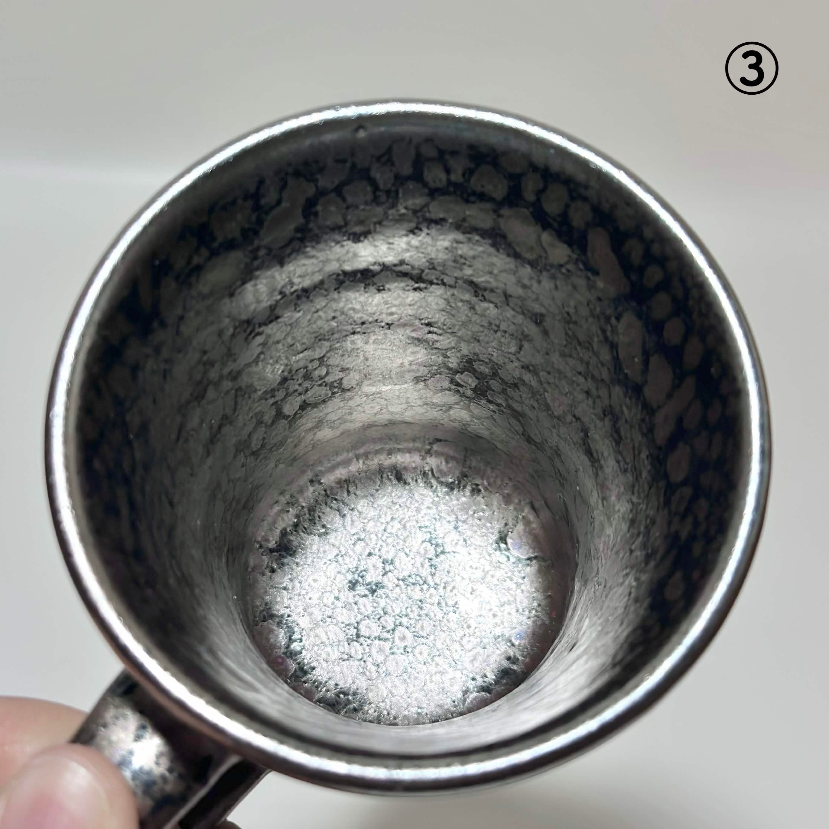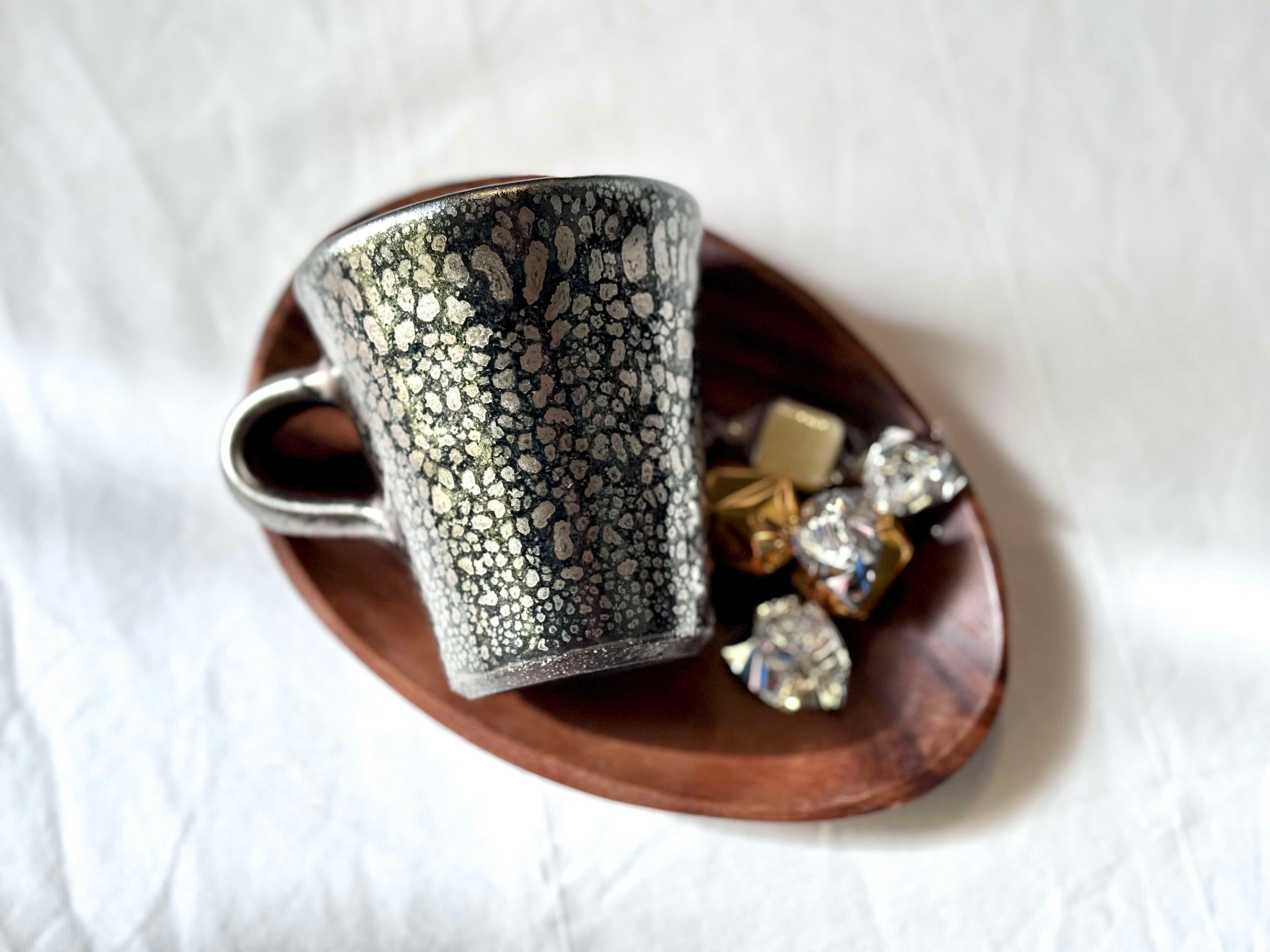 黒の地肌にポツンポツン油が分散してそうな不思議な釉薬です。